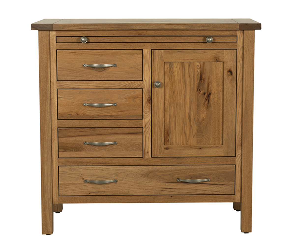 Features: • 1¼” Sawmill top with breadboard end • Pullout serving tray • One adjustable shelf behind door • Dovetailed drawers • Full extension drawer slides